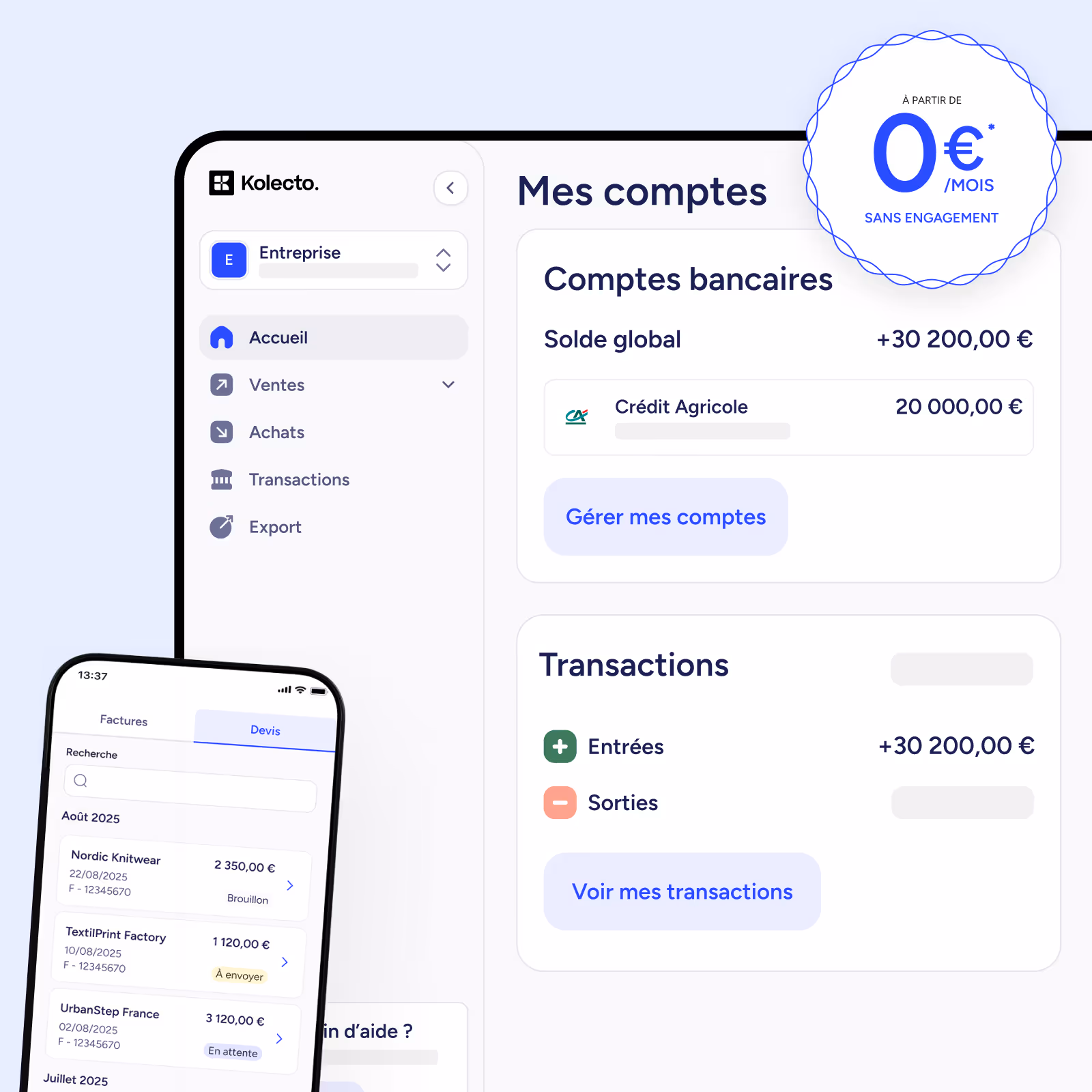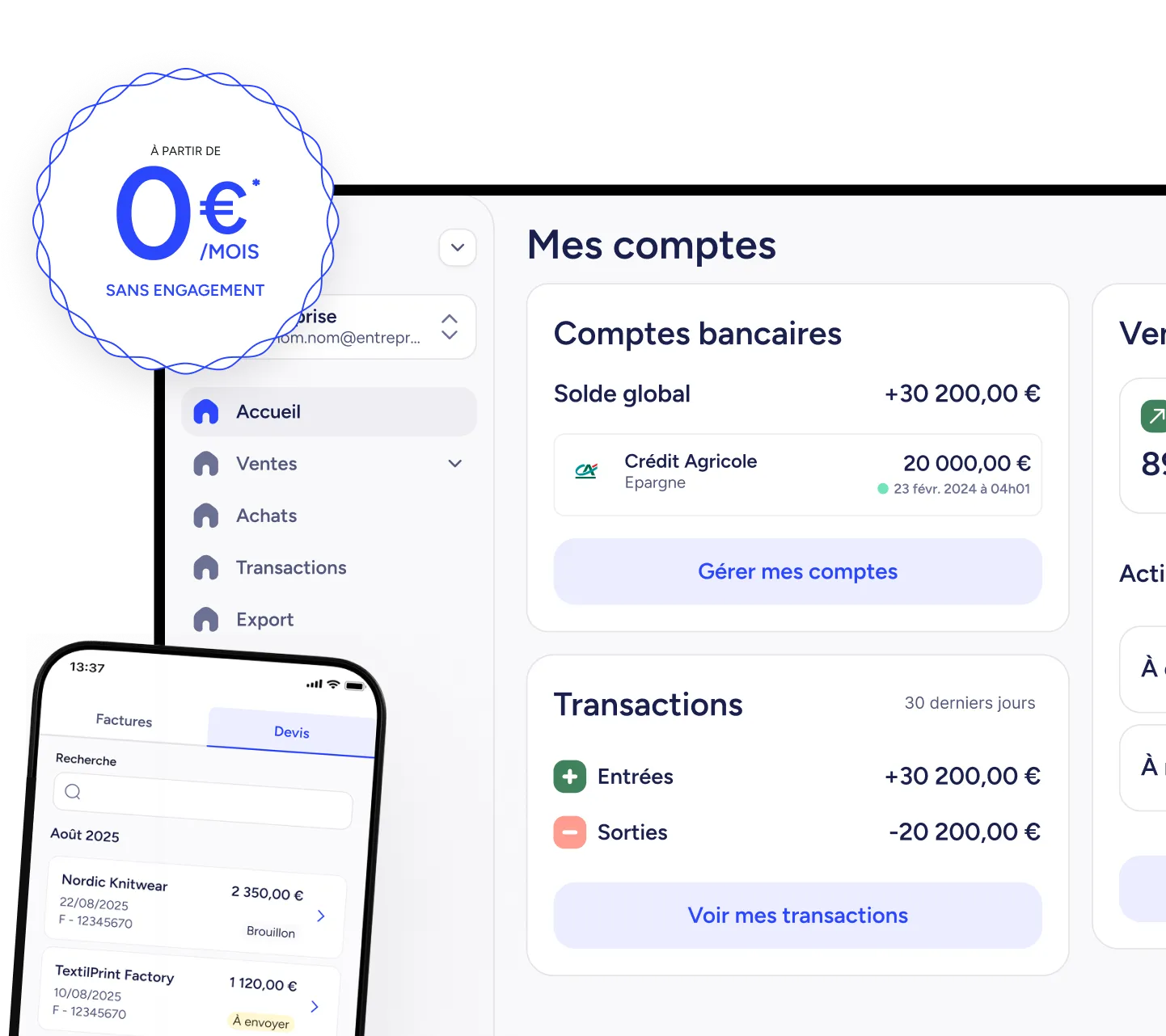 Créez et envoyez vos devis et factures en quelques clics, accélérez vos encaissements et minimisez vos impayés.